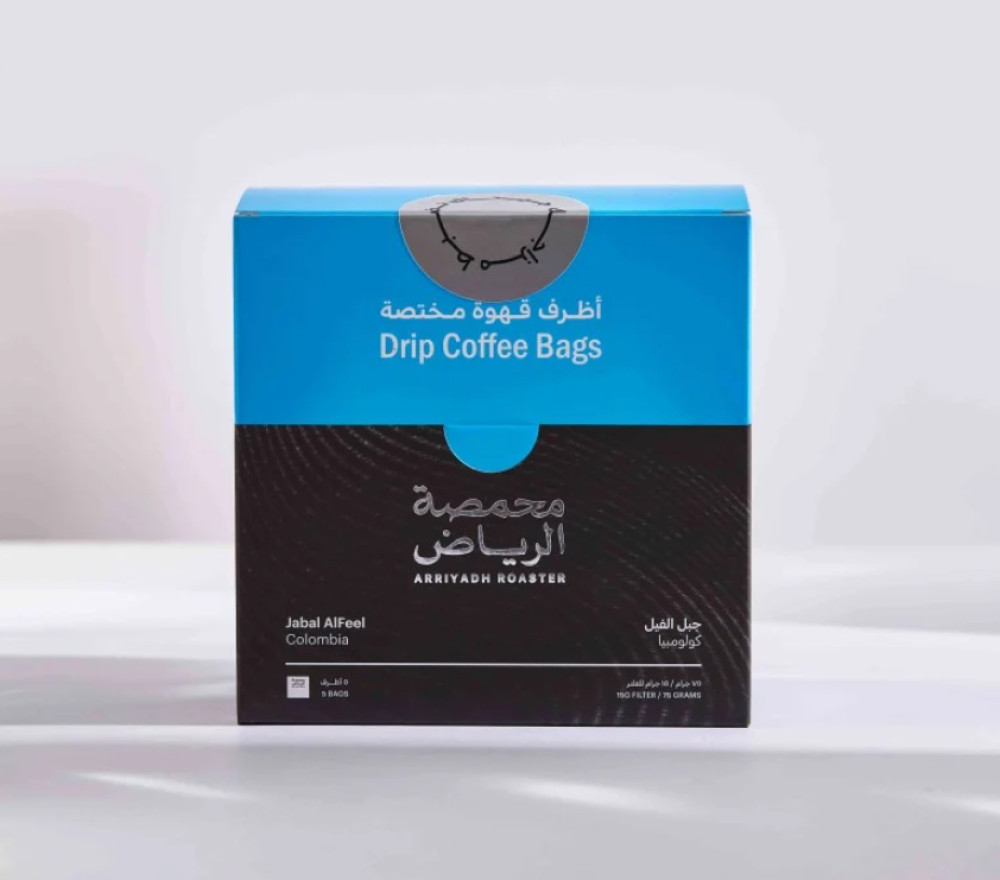 خمسة أظرف مميزة بتصميمها العملي، يحتوي كل منها على 15 جرام من قهوة (جبل الفيل) الكولومبية بإيحاءاتها المميزة بين حلاوة الشوكولاتة و الفواكة الحمراء و حموضة البرتقال والمكسرات.